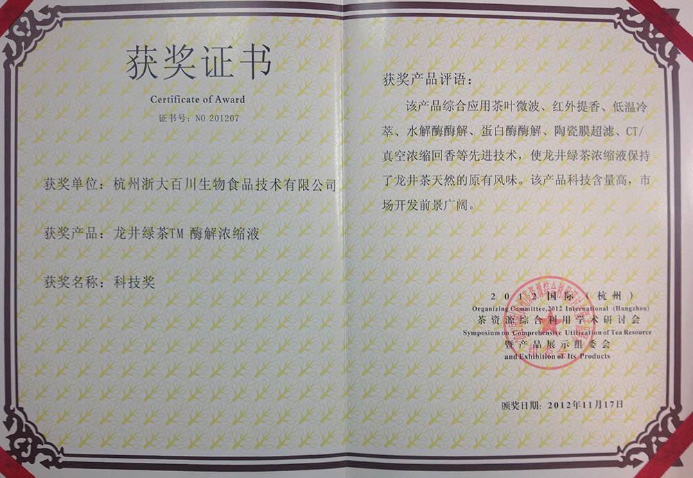 龍井綠茶酶解濃縮液——科技獎(2012)