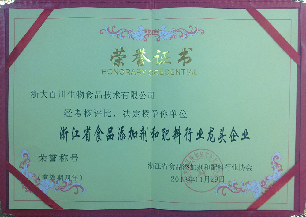 - Leading Enterprise in Food Additive & Ingredients Industry of Zhejiang Province