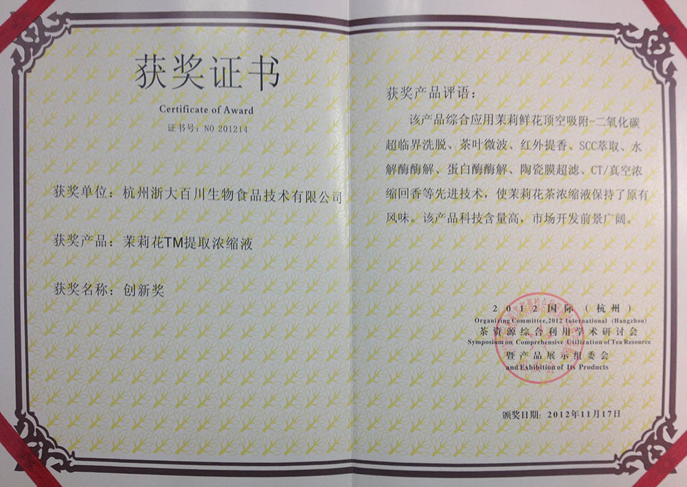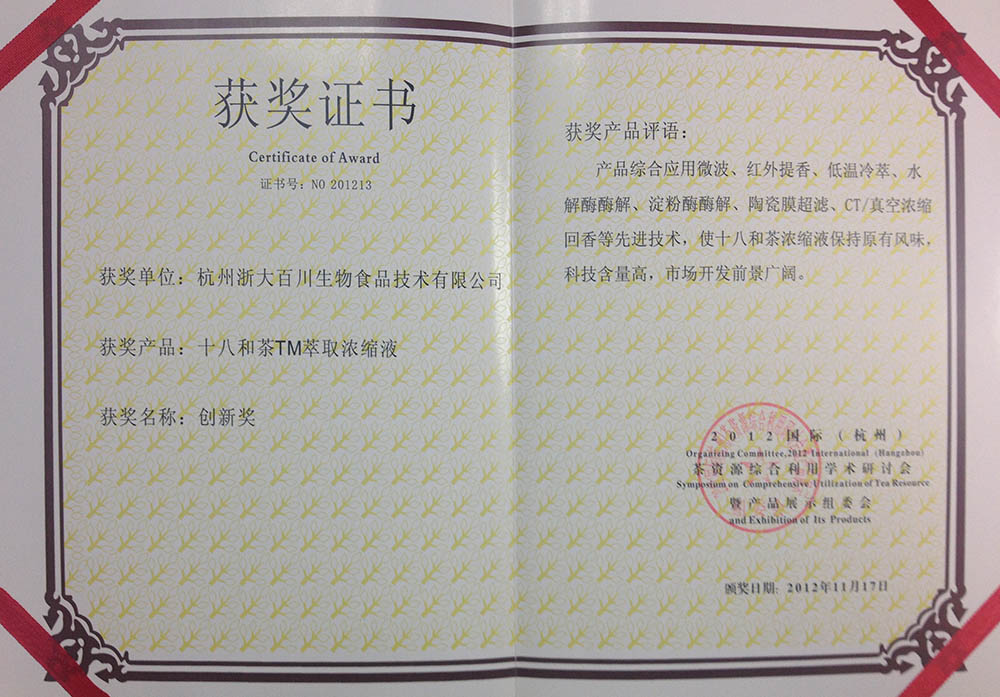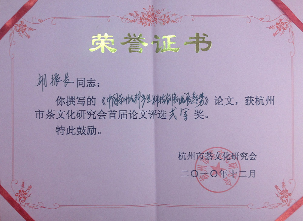 - Technology Award of Longjing Green Tea Enzymolysis Concentrate
